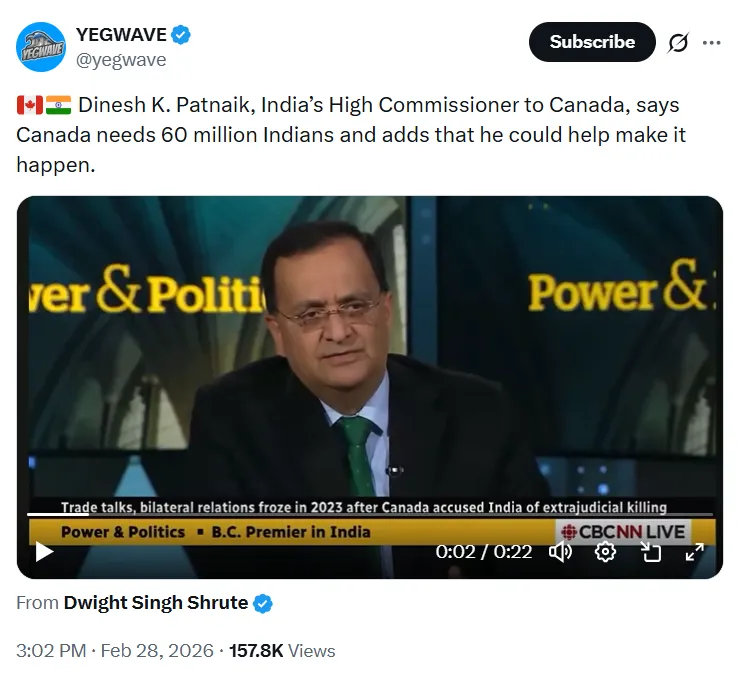 这已不是Dinesh Patnaik第一次提出惊人提议——上月底,他还声称,由于加拿大与印度的经济结构“互补”,加拿大应该欢迎多达6000万印度人移居该国。