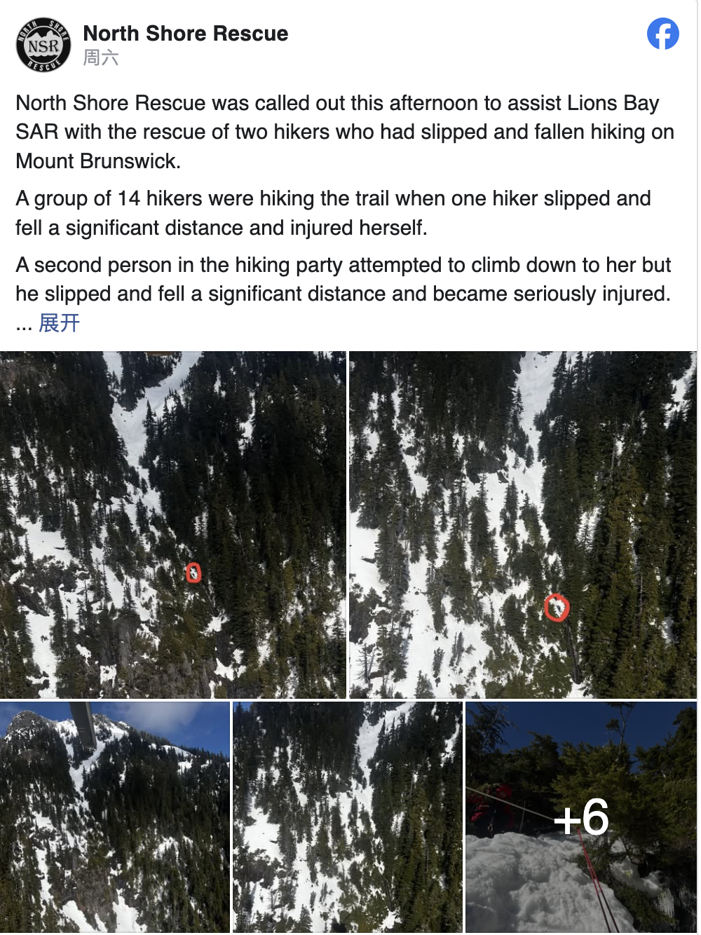 Lions Bay Search and Rescue 表示,这次行动复杂且风险极高,救援队甚至接连出动了两架直升机,还动用了专业绳索设备,事发地的地形极其陡峭、积雪非常严重。