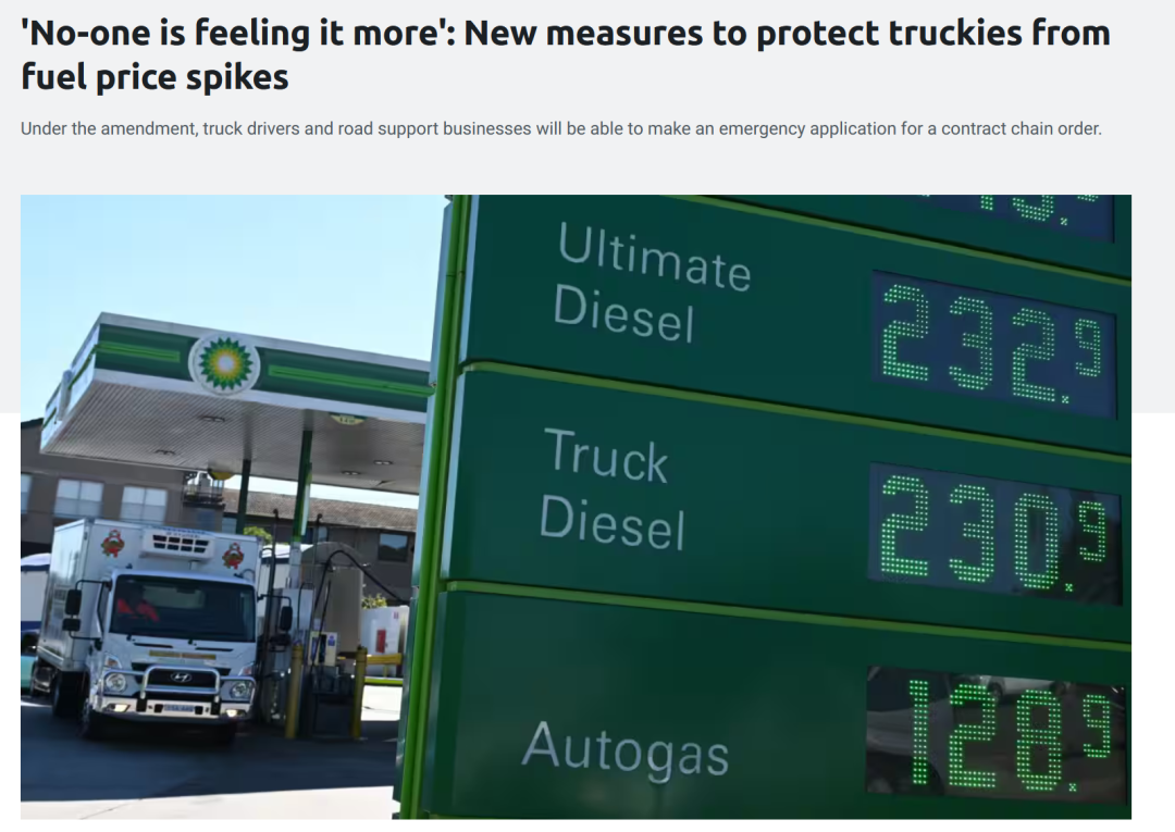 联邦政府也已选择先保证不要出现罢工停运,目前宣布将修改《公平工作法》,"以保护卡车司机免受中东战争导致的油价飙升影响”。