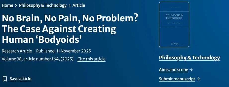 简单地说,这篇文章提出了一个概念,叫“bodyoid”,即通过干细胞和基因编辑技术,培育出没有大脑、不具备意识和痛觉的人类身体,用于医学研究和器官移植。