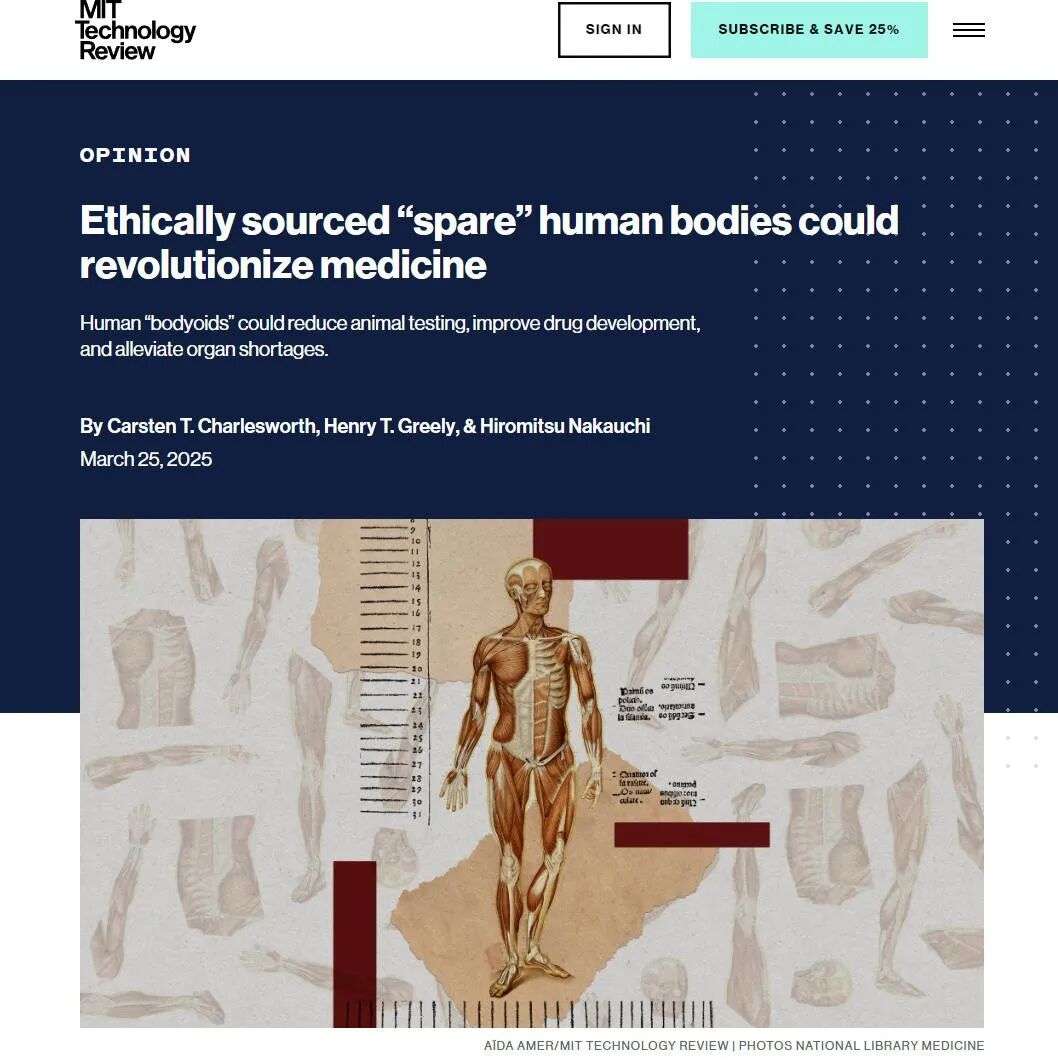 2025年3月,三位斯坦福大学的研究者在《麻省理工科技评论》上发表了一篇文章,标题极其直白:《以合乎伦理的方式获取的备用人体,可能将彻底改变医学》。