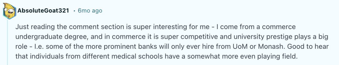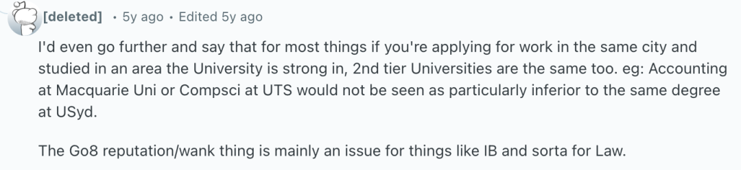 另一位网友表示: “我甚至可以说,对于大多数情况而言, 如果你申请的是同一城市的工作, 并且所学专业也是该大学的优势领域, 那么二流大学的水平也与之相当。 例如,麦考瑞大学的会计学或悉尼科技大学的就算计科学专业, 并不会被认为比悉尼大学的同类学位逊色多少。Go8的声誉/吹捧问题主要影响投资银行等领域, 对法律也有一定的影响。”