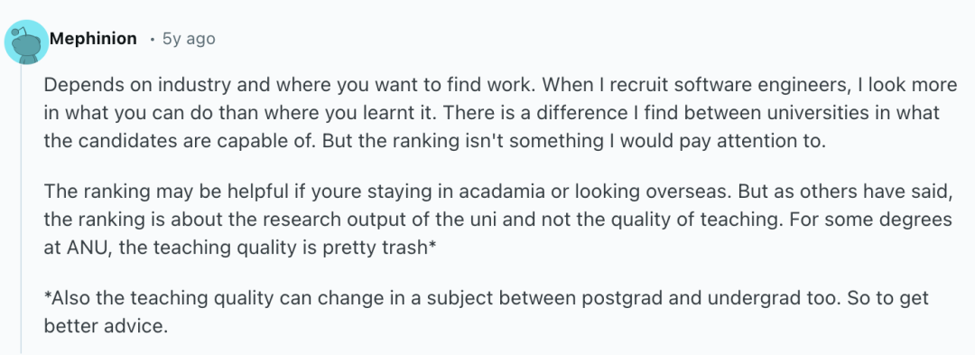 还有人提到,对排名的重视程度也与就业国家相关: “这取决于你的专业和职业发展方向。以我的经验来看, 你的教育质量(这回在你参加任何面试以及长远发展中体现出来) 比院校本身更加重要, 不过当我在美国工作时, 澳国立大学的声望确实是一个优势。