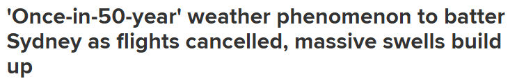 一场被称为“50年一遇”的极端天气,正席卷澳大利亚东海岸。从悉尼到墨尔本,狂风、暴雨、巨浪接连来袭,航班大面积取消,交通系统一度瘫痪。