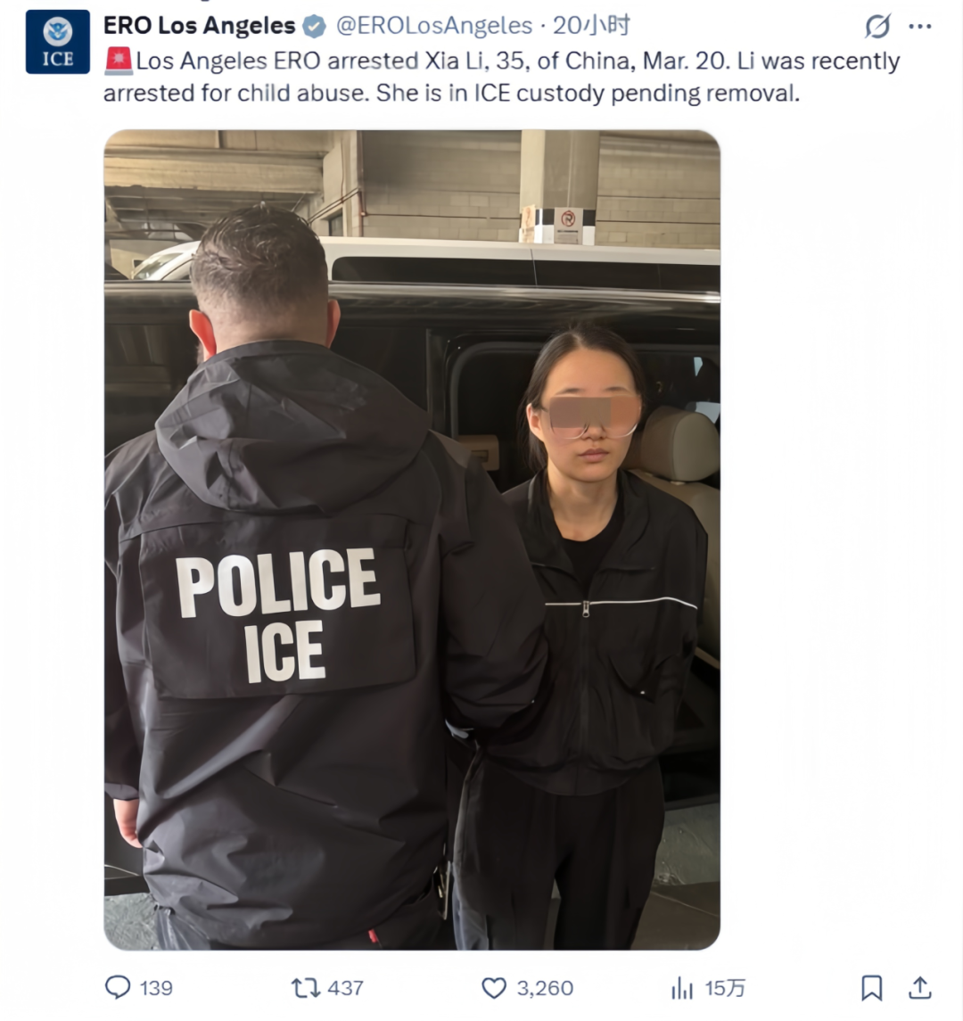 根据美国移民及海关执法局(ICE)洛杉矶移民执法与遣返办公室(ERO)公布,3月20日逮捕了一名35岁的中国公民李霞(Xia Li,音译)。据官方通报,李霞此前因涉嫌虐待儿童被当地执法部门逮捕,目前已被ICE拘留,等待进一步的遣返程序。