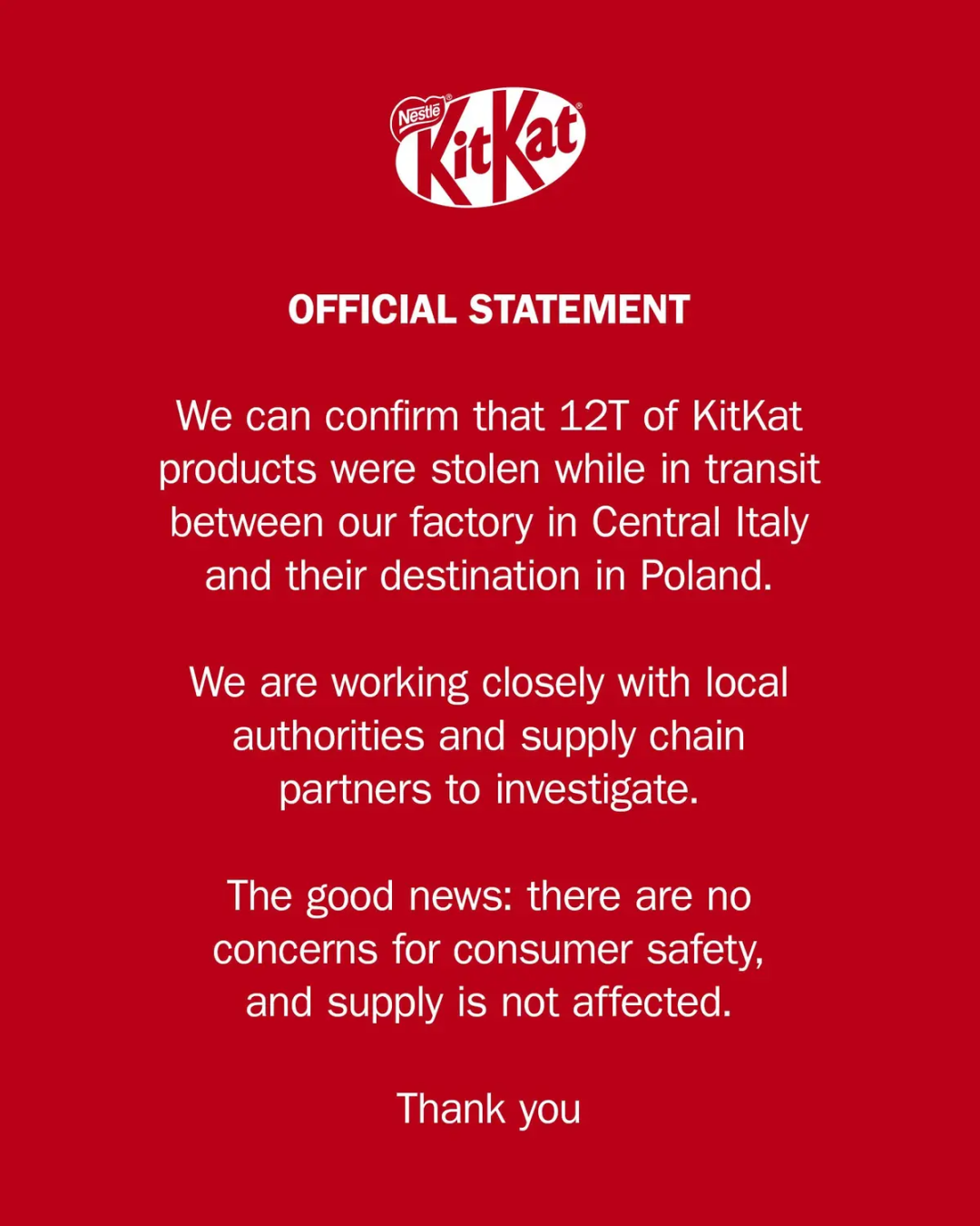 “我们可以确认,12吨的KitKat产品,在从我们位于意大利中部的工厂运往波兰目的地的途中被盗。
