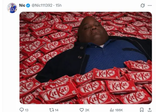 “我们一直鼓励大家用KITKAT来个‘休息’(have a break)——但看起来这帮小偷对这句话的理解有点太字面意思了,他们直接带着我们12吨的巧克力‘跑路’(made a break)了。”