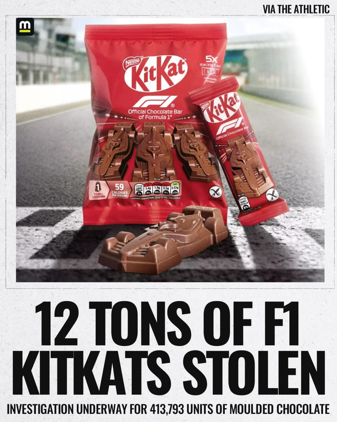 而这次惨遭零元购的,正是这批新鲜出炉的F1赛车巧克力棒…………