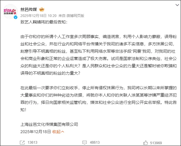 此前,丝芭传媒称鞠婧祎多次罔顾事实、编造谎言,“涉嫌严重经济犯罪”。2025年12月18日,丝芭传媒曾喊话鞠婧祎:再不收手将实名举报。