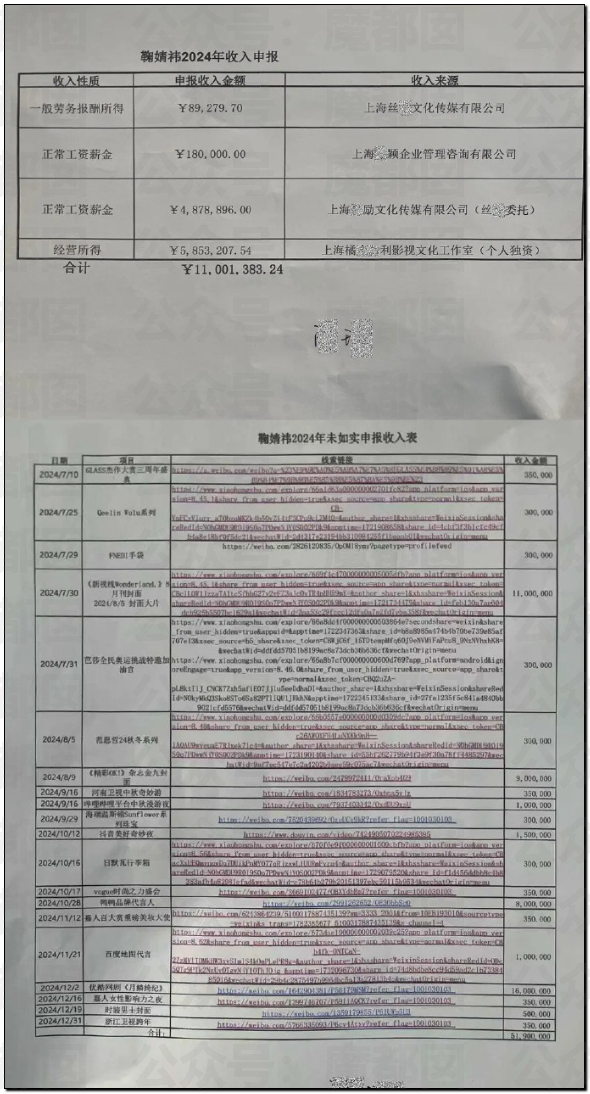 看得出来丝芭对鞠婧祎真的恨极了。而且好像这是比较罕见的艺人收入明细吧: