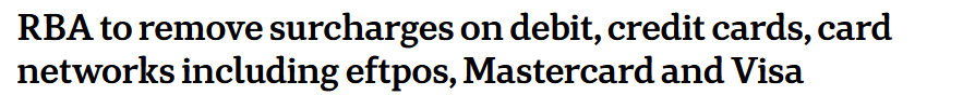 澳洲央行今日正式官宣:在澳洲全面禁止刷卡支付附加费。