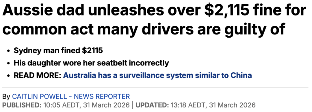 最近,一位悉尼父亲在网上发帖吐槽,他十几岁的女儿因为安全带没系好被摄像头拍下,他收到了一张$2115的罚单。