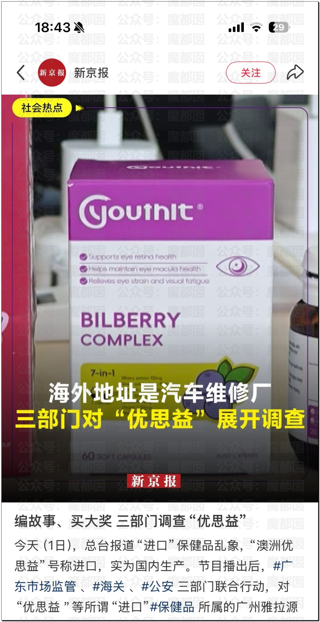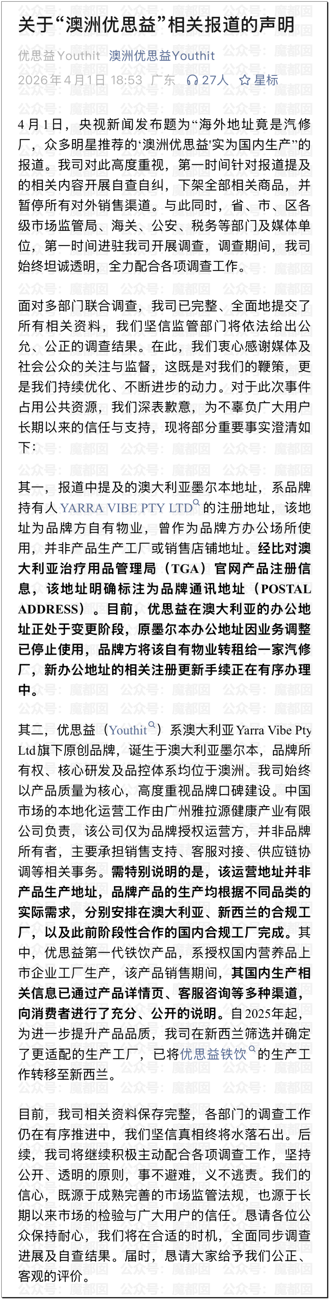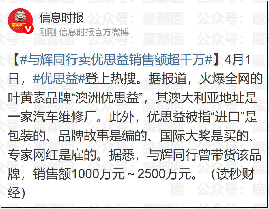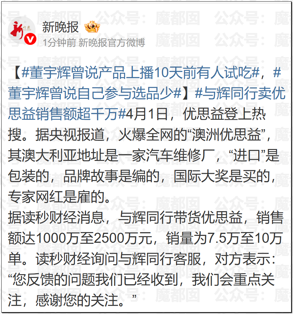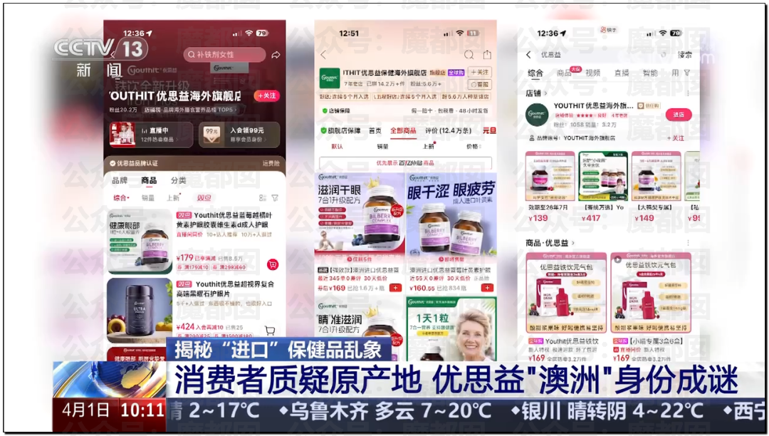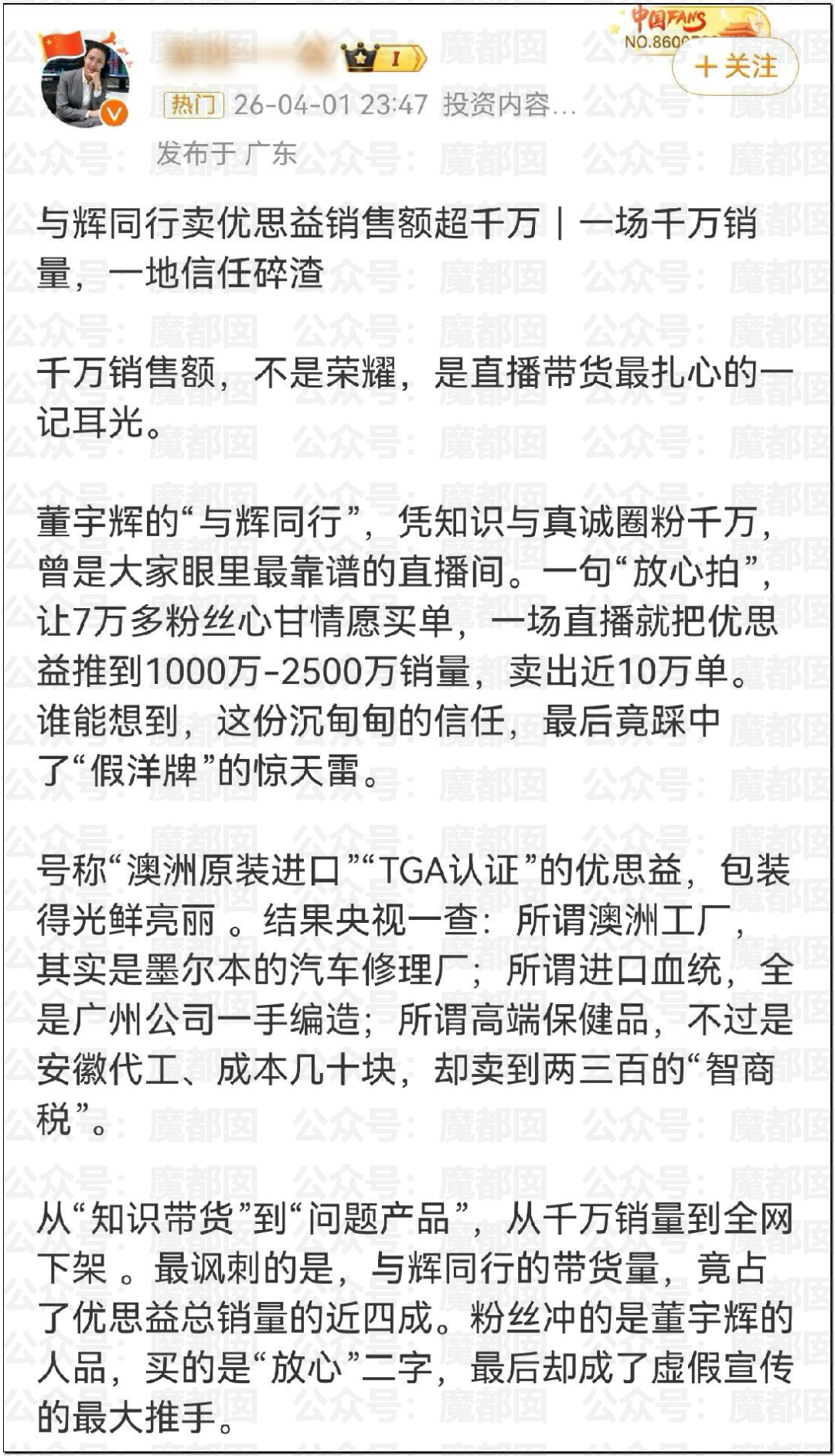 目前第三方统计:销售额 1000万–2500万元,董宇辉占优思益总销量近4成,为其最核心带货渠道。假澳洲进口:宣称澳洲产地,地址实为墨尔本汽车修理厂。真产地:实际由安徽马鞍山代工,成本几十元,售价293–434元。