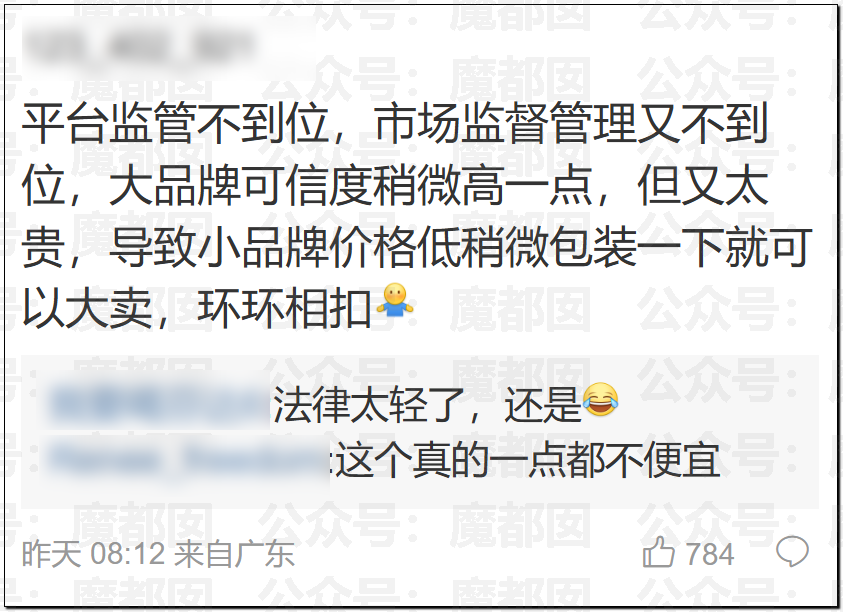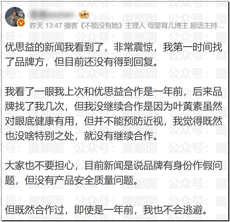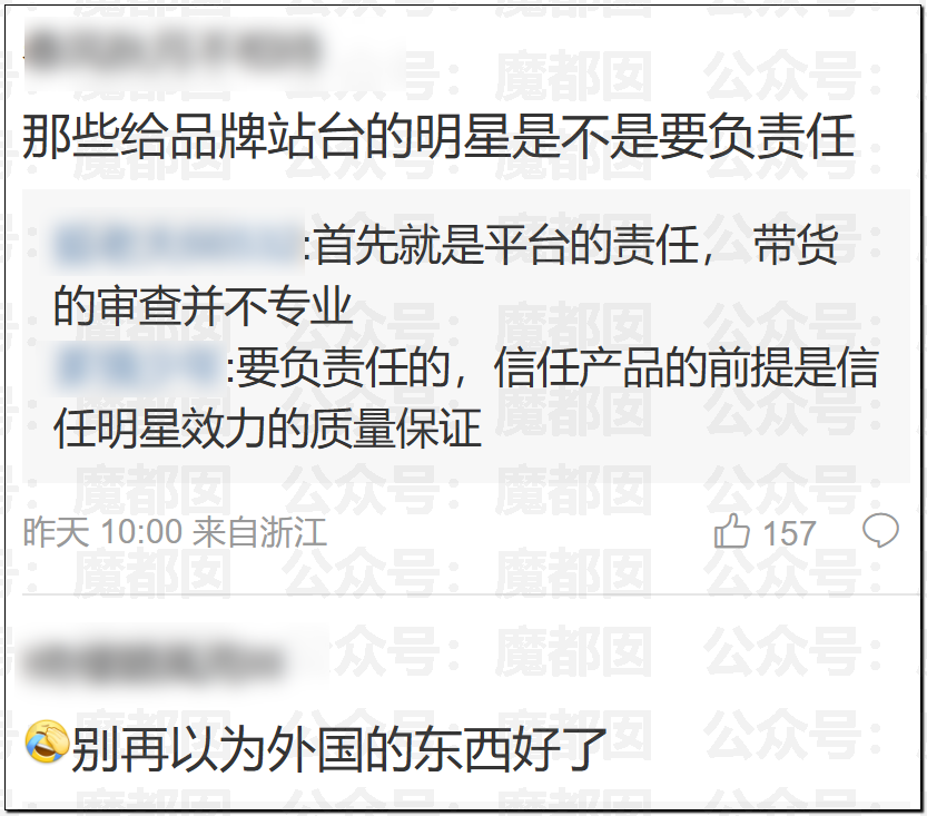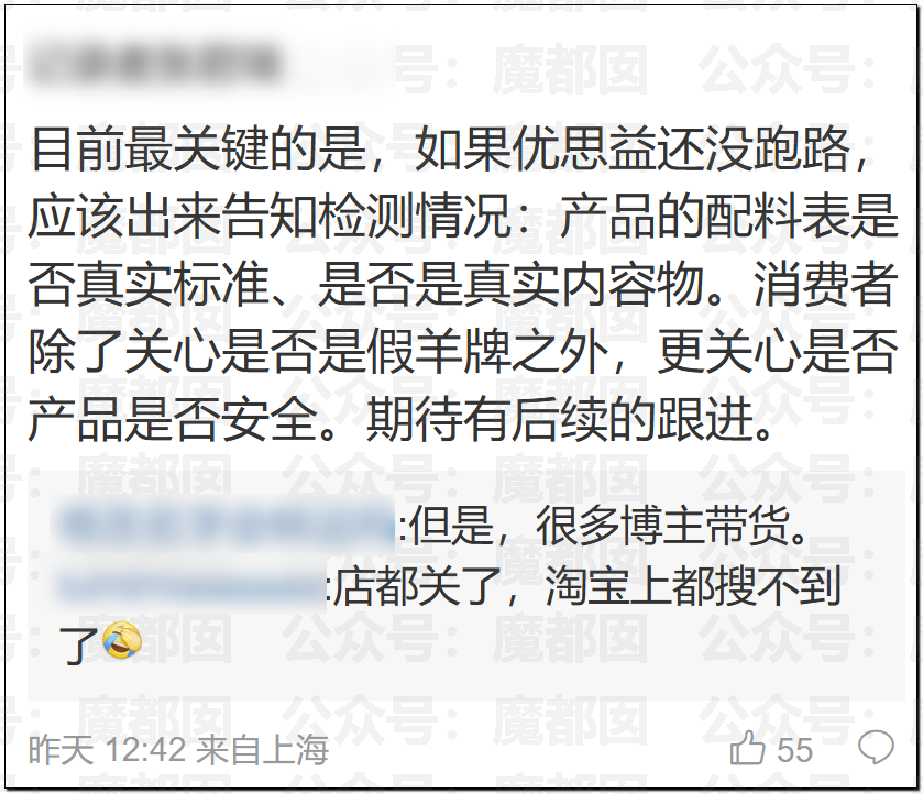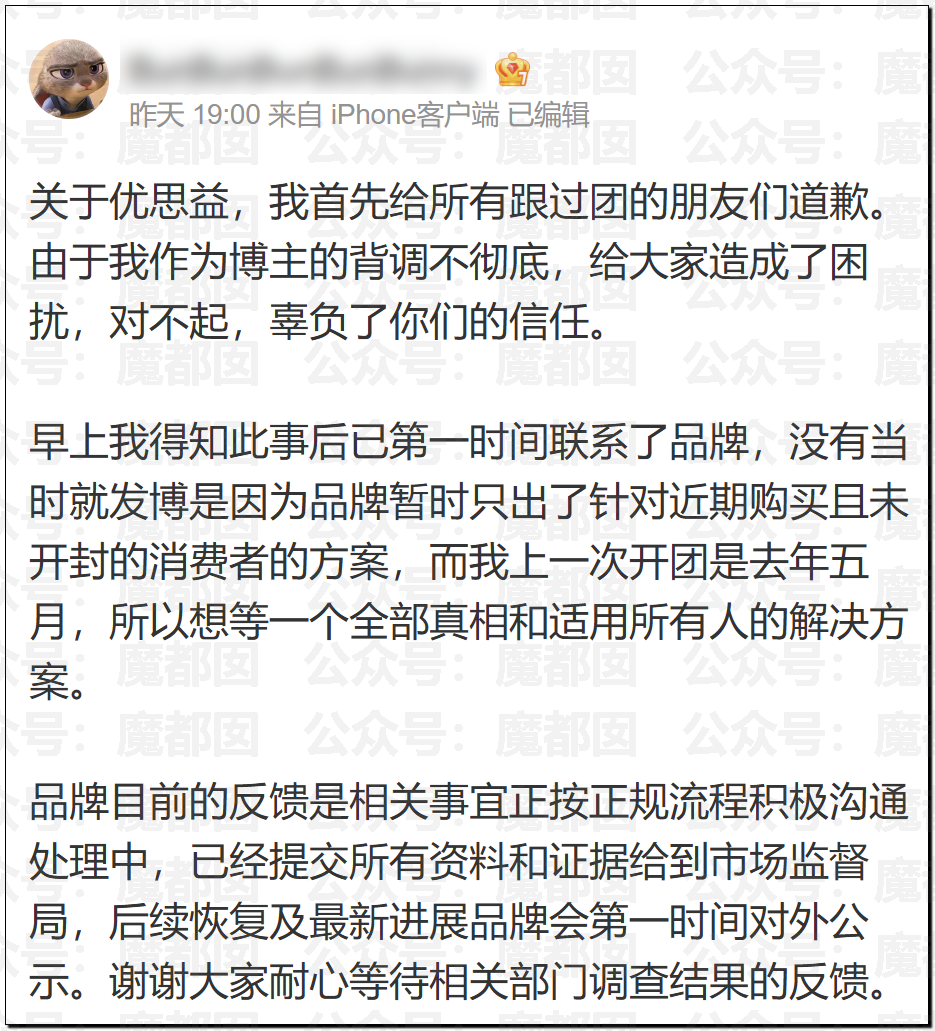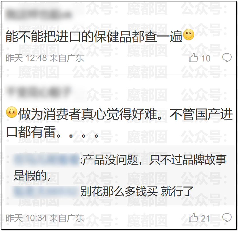 大家也看到了。很多博主在道歉并声明负责售后。但是感觉这个道歉和声明也是统一模板的,中心意思都是:1.自己也买了也在吃;2.品牌方联系不上,但会负责售后;3.庆幸不是产品质量问题;4.背调不仔细,会引以为戒。而评论区里也会有“不是你的错,还会继续支持”的留言。