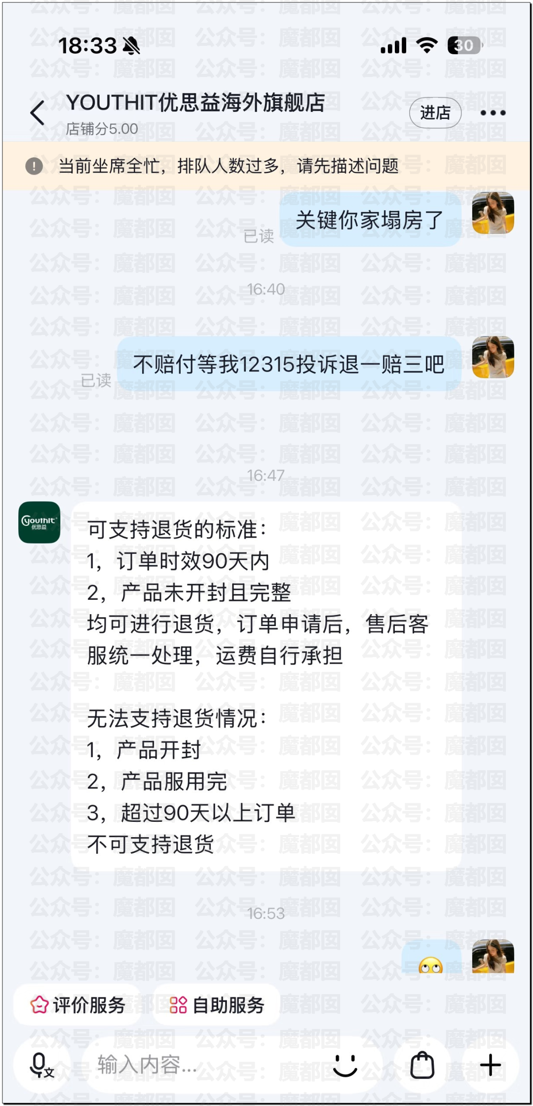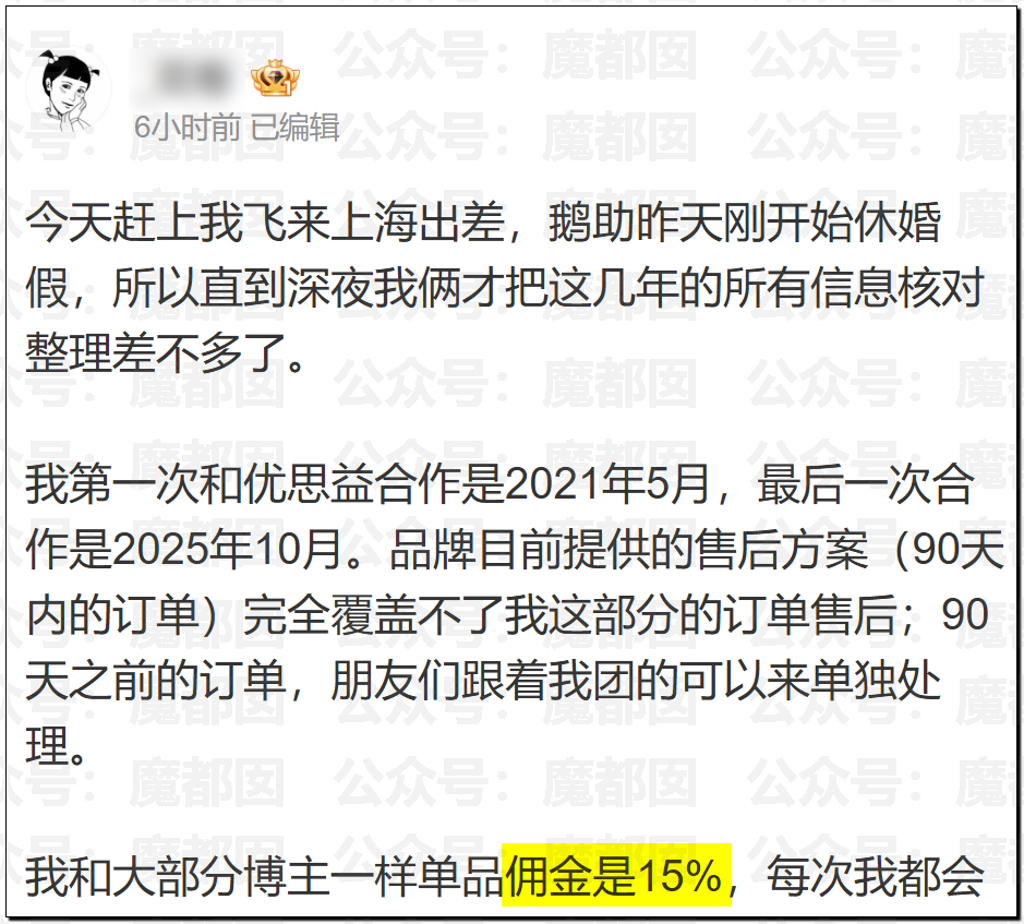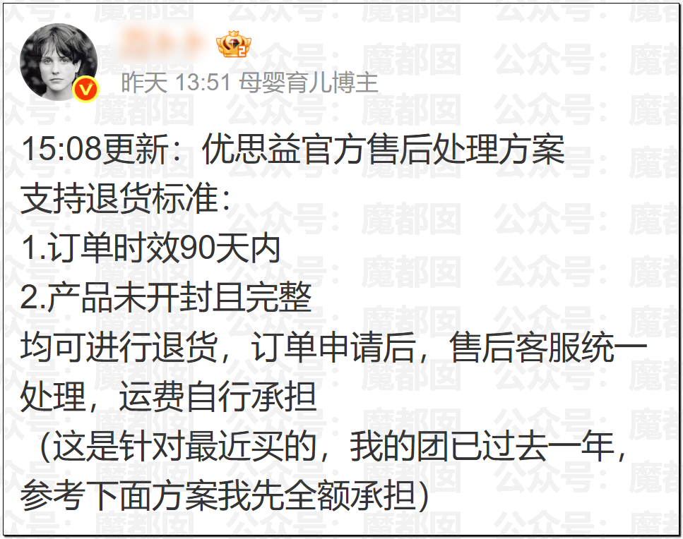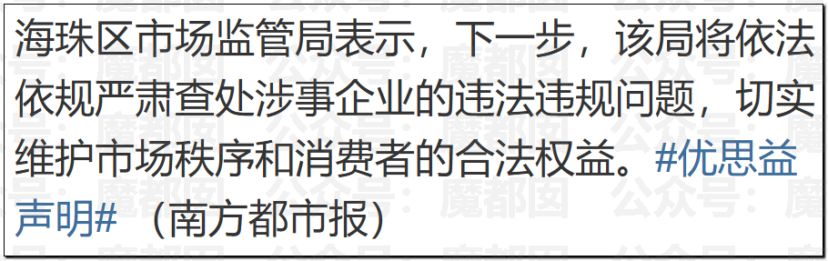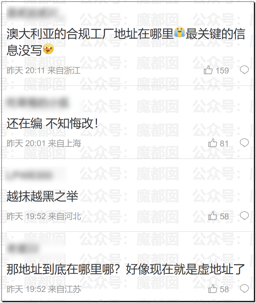 大家也看到了。很多博主在道歉并声明负责售后。但是感觉这个道歉和声明也是统一模板的,中心意思都是:1.自己也买了也在吃;2.品牌方联系不上,但会负责售后;3.庆幸不是产品质量问题;4.背调不仔细,会引以为戒。而评论区里也会有“不是你的错,还会继续支持”的留言。