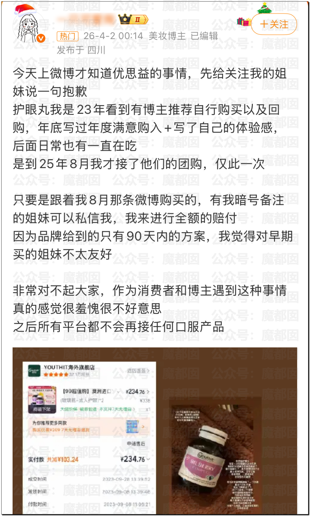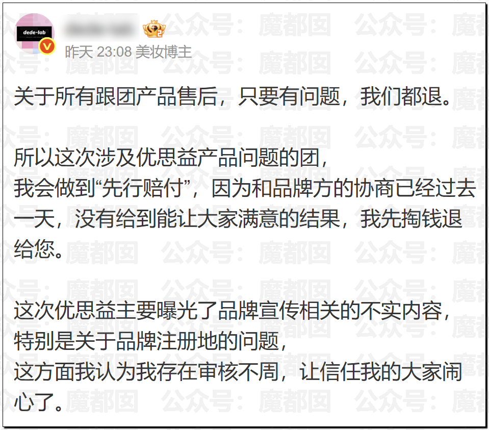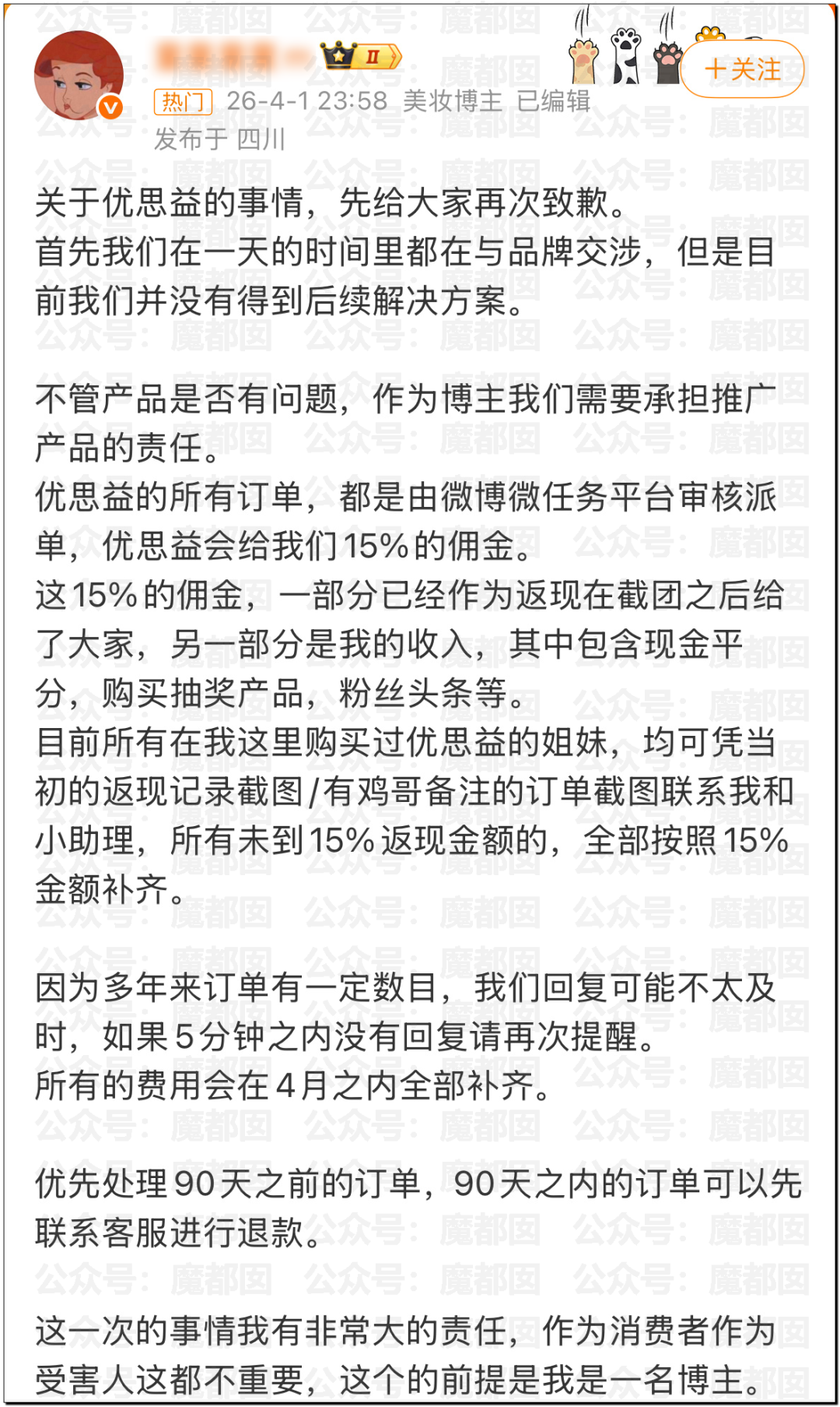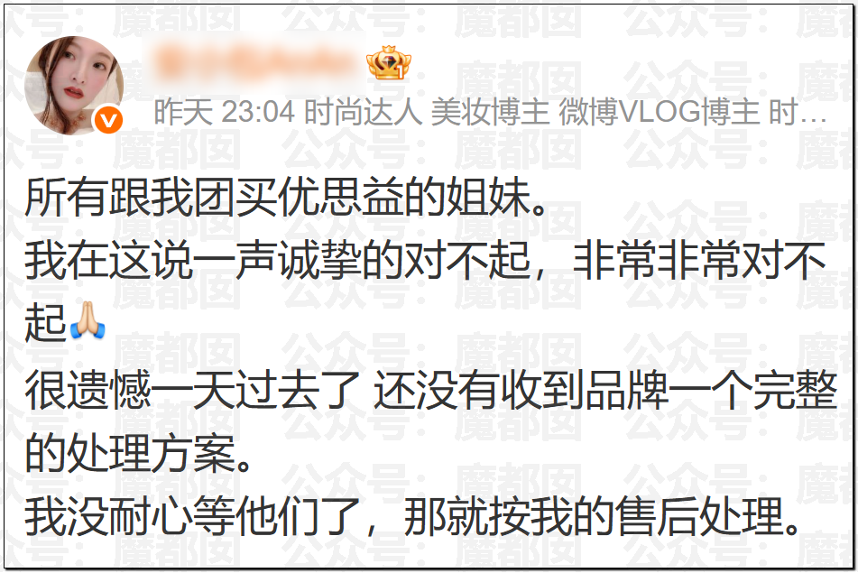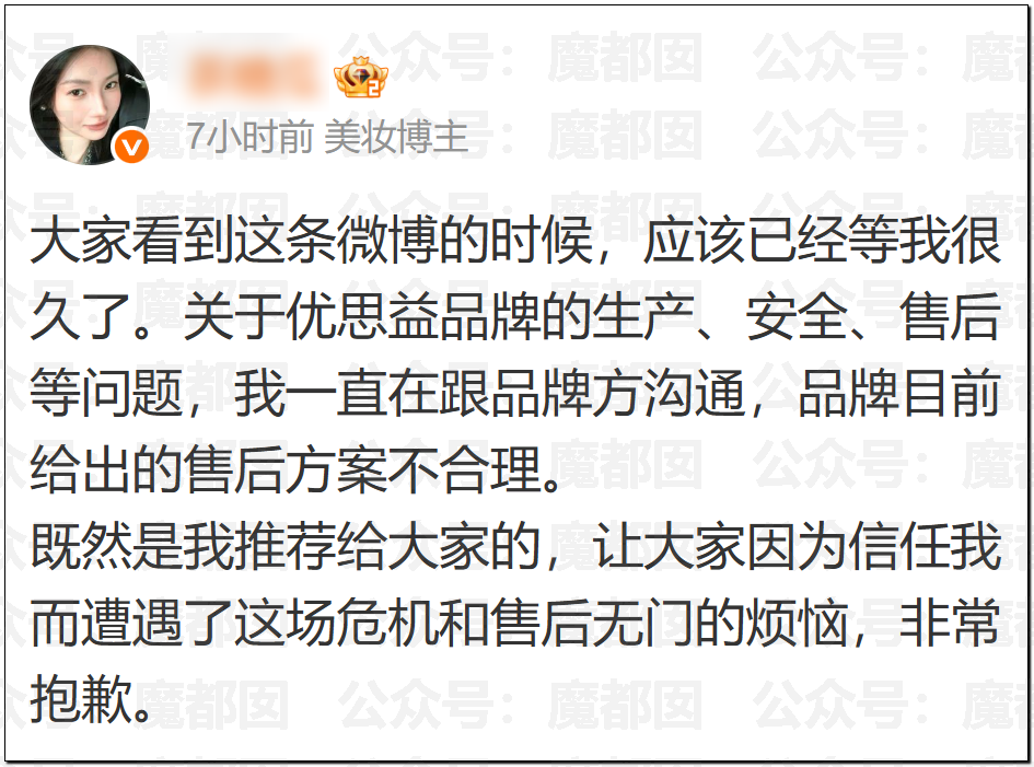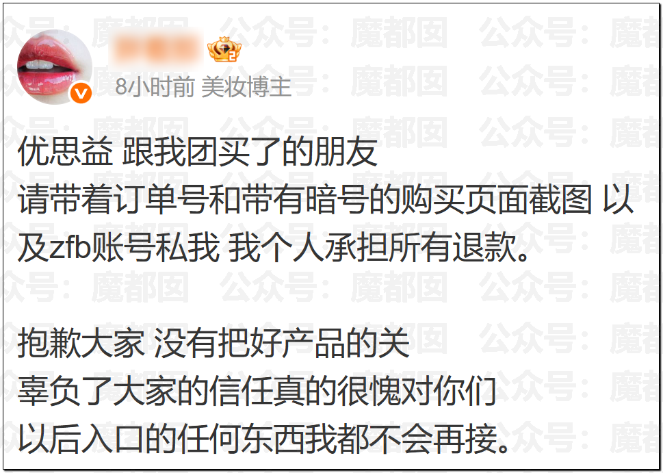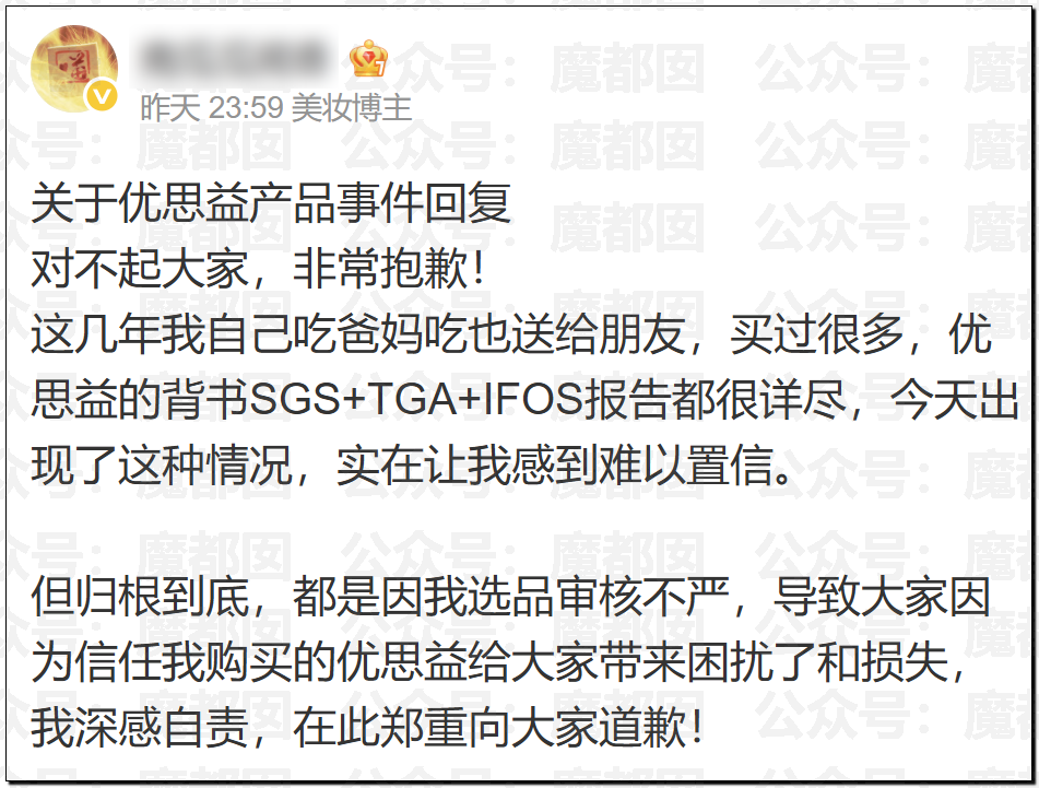 因为这个东西主要靠的就是网络销量,所以大量的网红博主中招,纷纷道歉和赔偿。