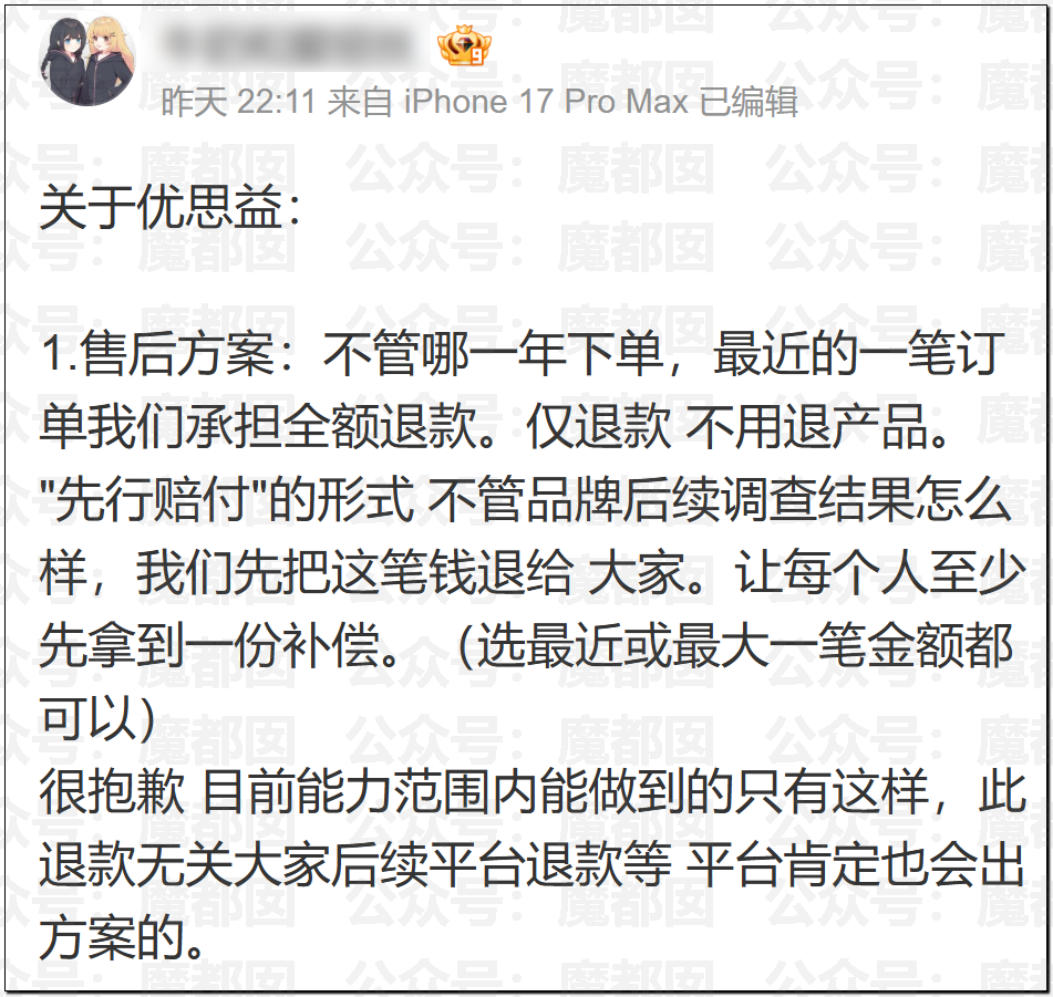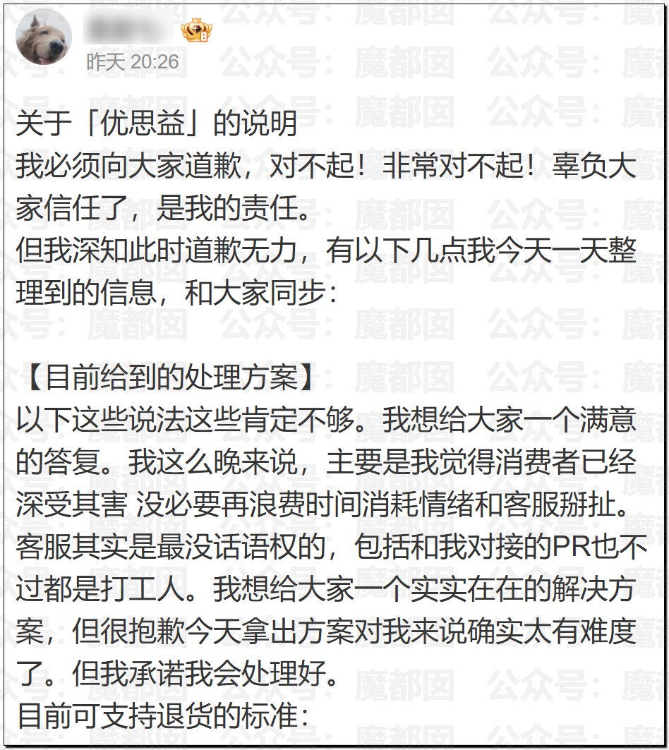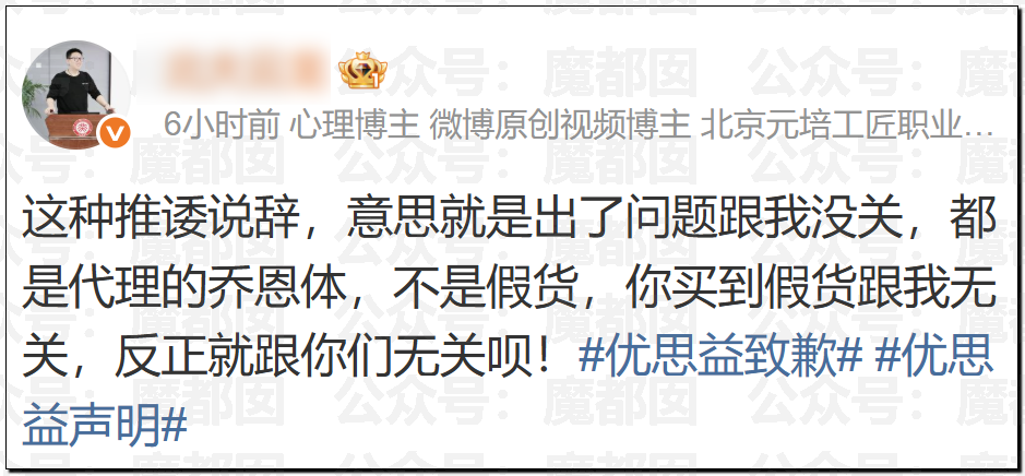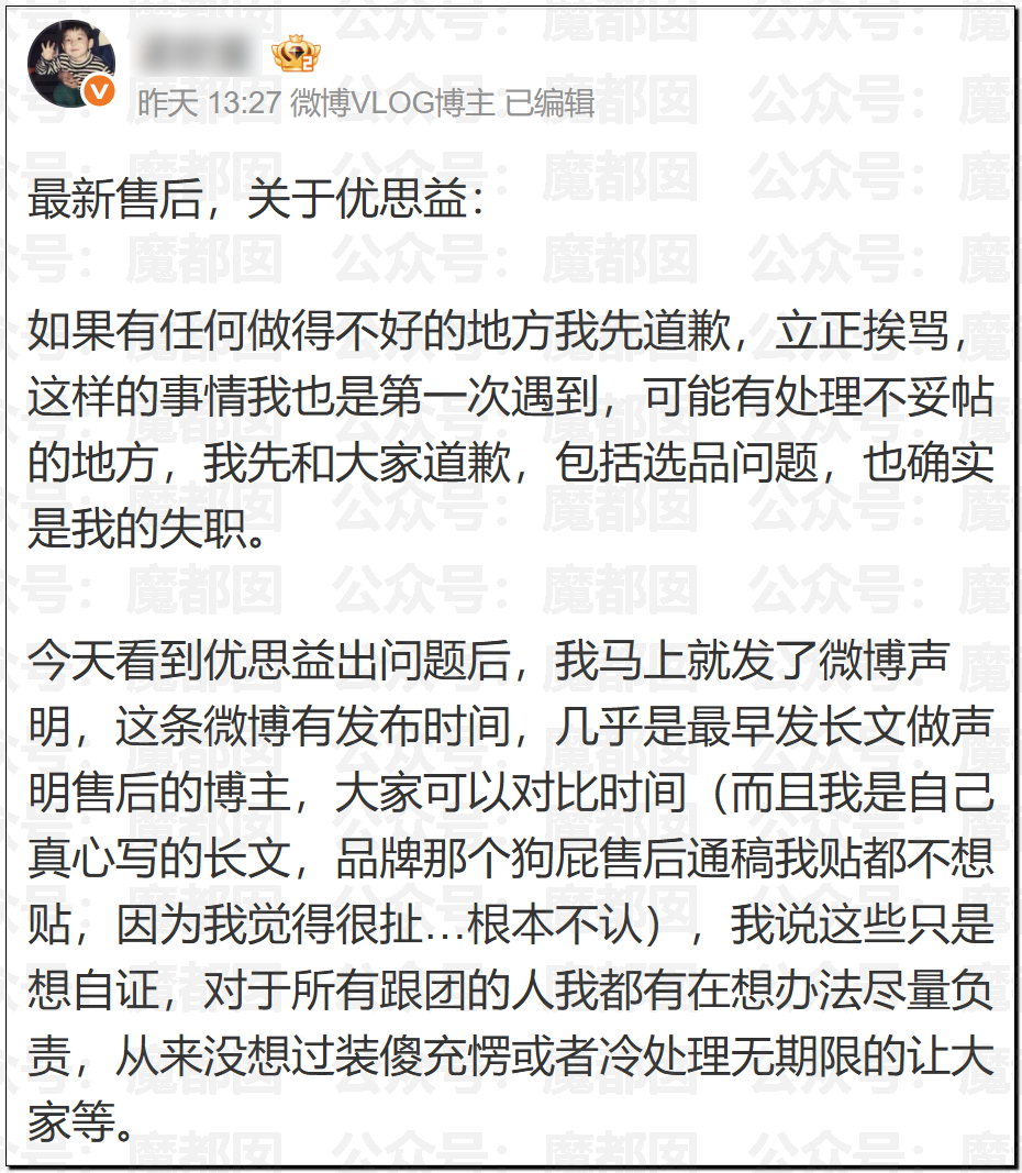 为何这次那么多的网红集体中招?优思益一爆雷,就看到微博上这些大大小小的博主分别出来发道歉,有的说自己承担售后,有的说自己会持续跟进。