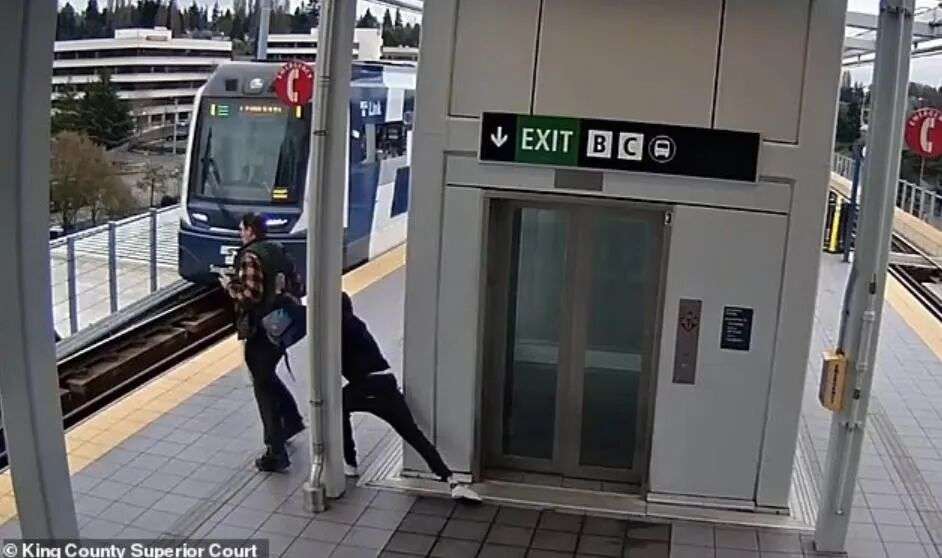 就在那一刹那,黑衣男貌似瞅准了机会,突然窜出来,从背后猛推了彼得一把,试图把他推下站台,摔到铁轨上。