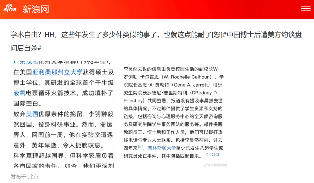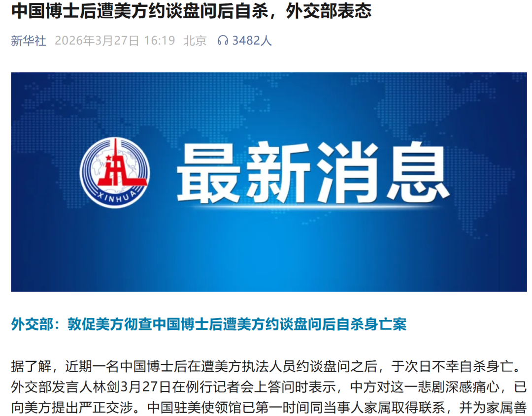 收藏中国博士后遭美方约谈后,自杀身亡! 细节首次曝光! 外交部及总领馆回应