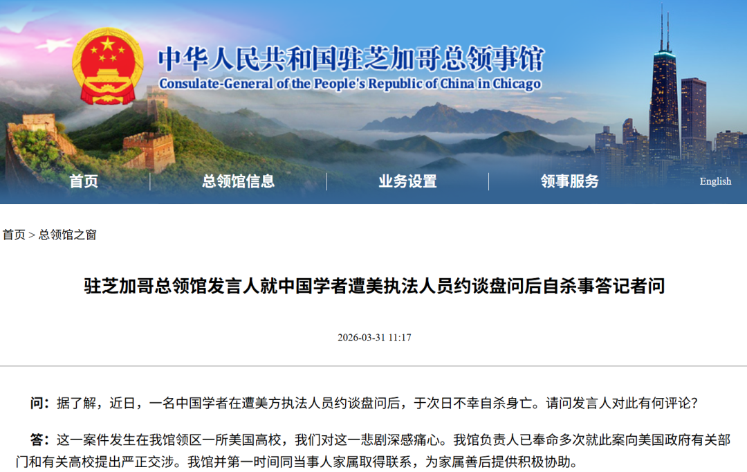 3月31日,中国驻芝加哥总领事馆发文表示,近日,一名中国籍学者在遭美方执法人员约谈盘问后,于次日不幸自杀身亡。