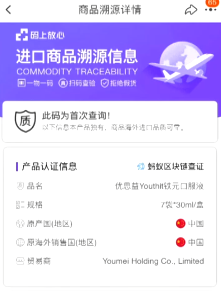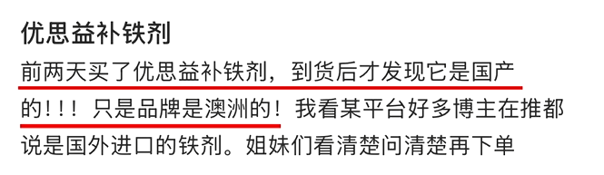 然而,有消费者对该品牌的产地产生了质疑,“买了优思益补铁剂,到货后才发现它是国产的”,还晒出了溯源信息,显示实际产品为国产。