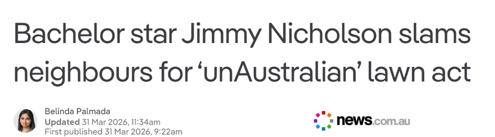 最近,澳洲网红明星Jimmy Nicholson就在社交媒体上“开撕”他的左右邻居,称他们非常“unAustralian”,起因就是邻居只割了自己家的草坪,没有管他家的。