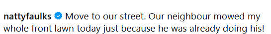 一位网友说:“搬到我们街上吧。今天我们的邻居修剪了我整个前院草坪,只因为他正在修剪自己家的草坪。”