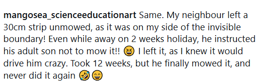 另一位网友说:“我的邻居留了30厘米宽的草地不修剪,因为那是我家的区域。即便我外出度假两周,他依然指示他的儿子不要帮我修剪。我也不修剪,因为我知道这会让他抓狂,果然,12周后,他修剪了。”