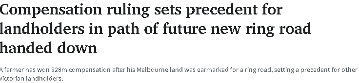 墨尔本西区有个农场主,因为政府规划要修一条大环城公路,占用了他一部分地,最后打官司拿到了2800万澳元赔偿,而且这个案例以后可能会影响很多类似业主。