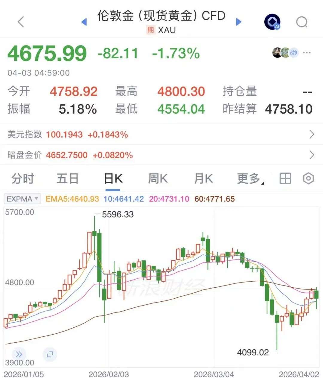 自美以袭击伊朗引发中东战事以来,国际金价剧烈震荡,截至最新收盘,现货黄金报4675.99美元,跌1.73%。
