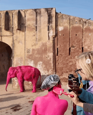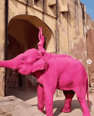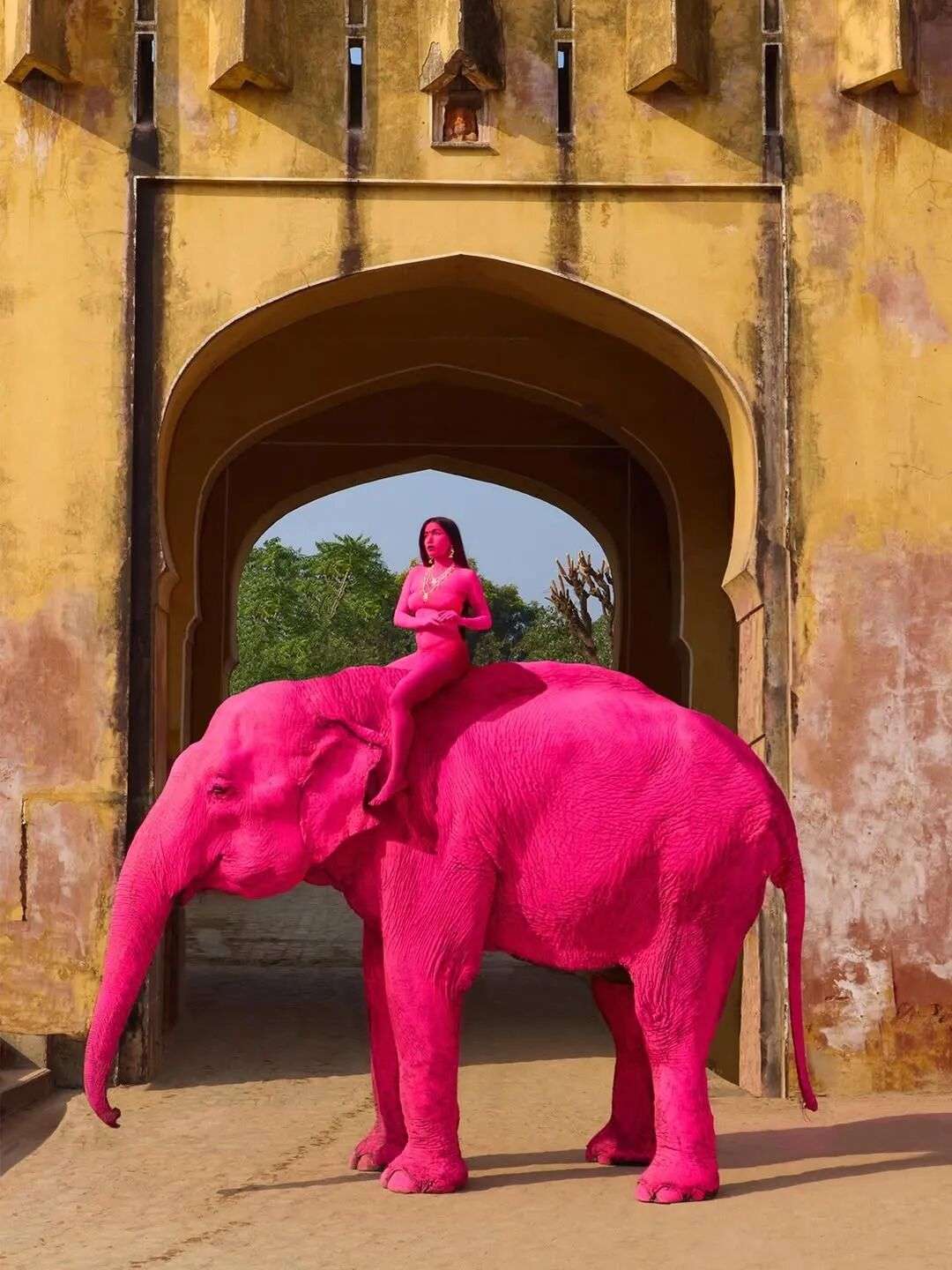 这太美了,这太绝了,我想找头大象涂成全粉色,再找个穿少一点的模特也全身涂满粉色,让她骑着粉色大象过古门!Let’s艺术!