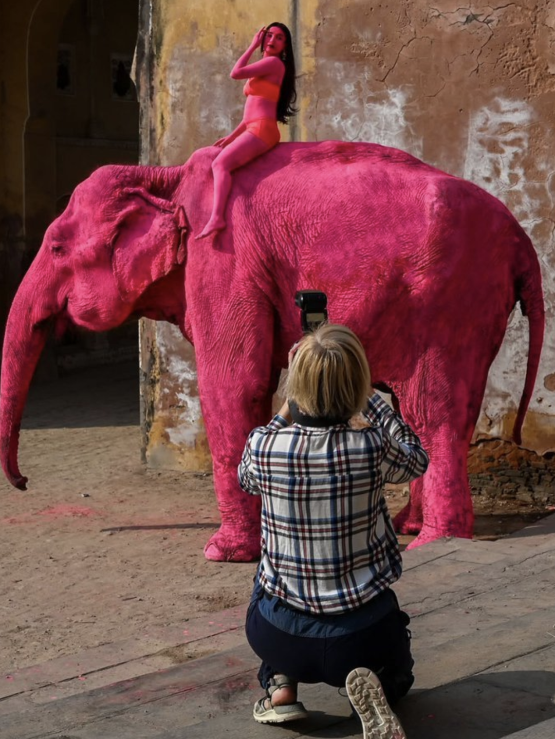 的确,如果真想要粉色的视觉效果,为啥不像印度当地人那样涂一点点粉色花纹,或者干脆把大象P成粉色,只让人类模特涂成粉色再来拍呢?