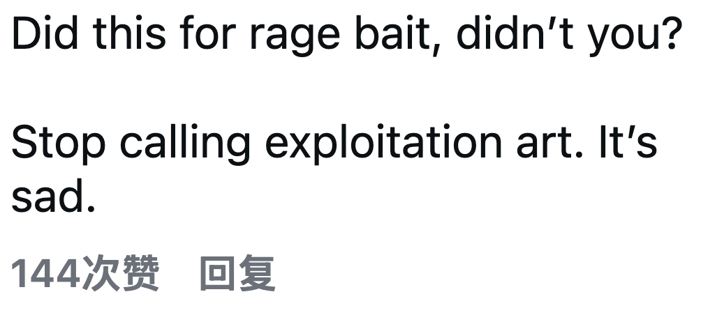 “你故意拍这种让人愤怒点击的东西,是不是?别说剥削是艺术了,那是很悲伤的。”