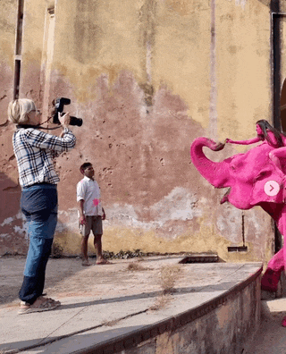 到这里,茱莉亚都没出啥差错。但拍摄途中路过城中古门,看到被饲养主牵着载客收钱,脸上涂了一些花纹的大象时,她灵机一动。