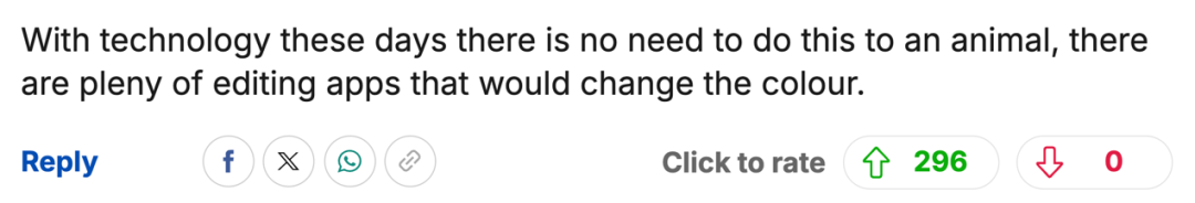 “以现在的科技,根本没必要这样对待一只动物,有那么多可以改色的P图APP。”