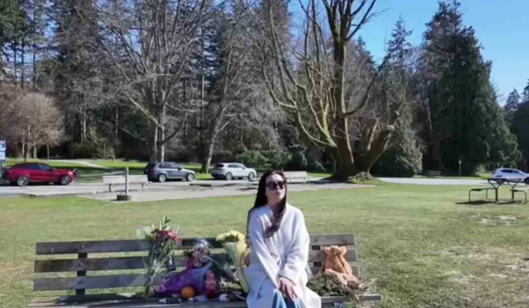 她戴着墨镜,现身温哥华史丹利公园(Stanley Park)的料峭春寒中。