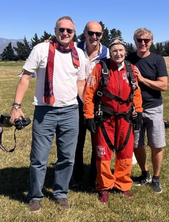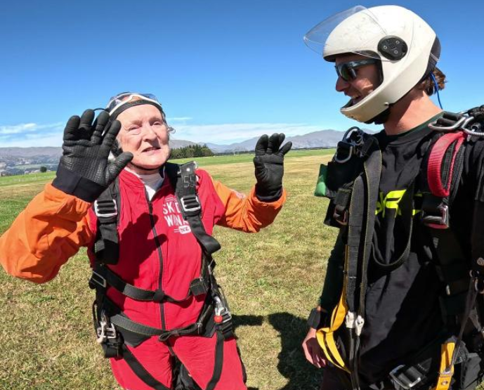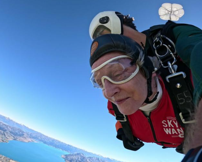 这位居住在基督城Papanui地区的90岁老人,近日在瓦纳卡(Wānaka)完成一次双人跳伞,圆了深藏多年的心愿。