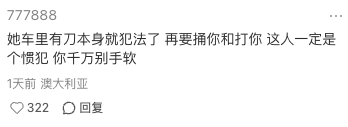 “她车里有刀本身就犯法了 再要撞你和打你 这人一定是个惯犯 你千万别手软”