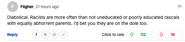 “Diabolical. Racists are more often than not uneducated or poorly educated rascals with equally abhorrent parents. I’d bet you they are on the dole too.”