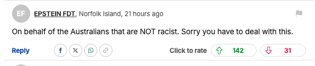 “On behalf of the Australians that are NOT racist. Sorry you have to deal with this.”