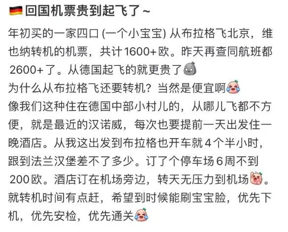 不止美国网友,德国的华人也抱怨机票从1600欧元直接涨了1000,如果从德国更贵。