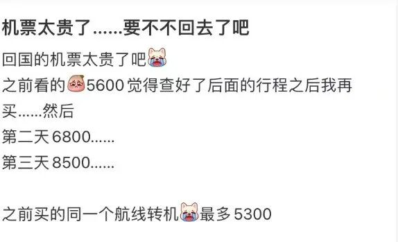 三月初买的往返机票6300人民币,现在已经接近1万;有人暑假往返机票,一个月直接翻了3倍;甚至有一家三口,前一天还是3万多,第二天就变成接近6万人民币。