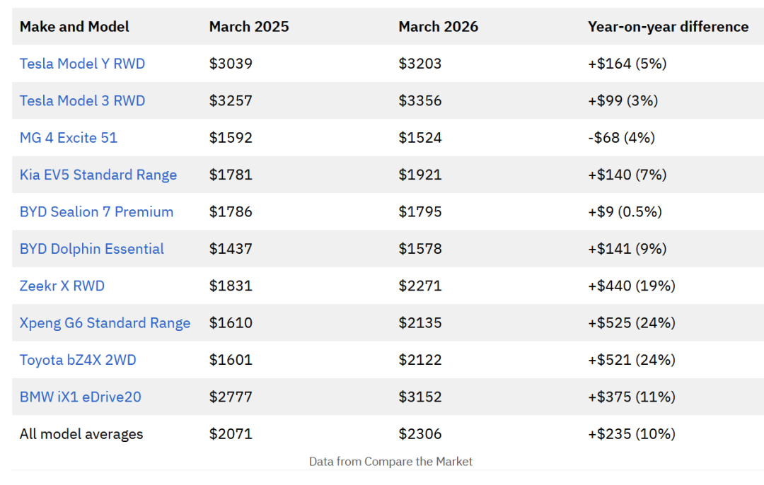 数据显示,目前澳洲电动车平均全险保费约为每年2300澳元,超过混动车型的平均约1700澳元。特斯拉最贵,已是3000+。