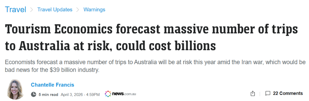 根据牛津经济研究院旗下机构Tourism Economics的分析,如果中东地区冲突持续升级,全球航空网络受扰,许多国际航班将受到影响,进而影响游客前往澳洲的计划。