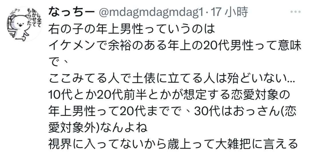 不过有日本网友解释道,右边这个18岁少女找的“年上男友”,是指25、26岁左右的英俊小伙,而不是常见的油腻大肚中年男。