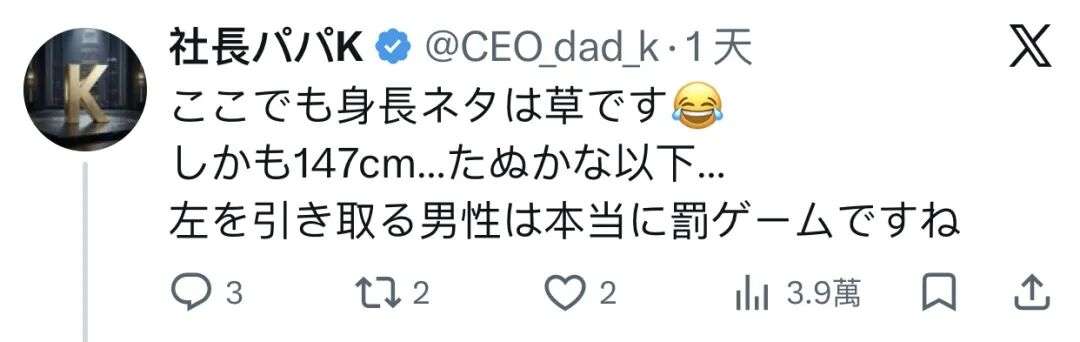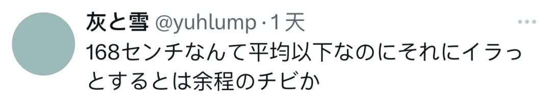 “男性168厘米明显是低于日本男性的平均身高,而博主你这么生气,很明显是你连168厘米都没有。”