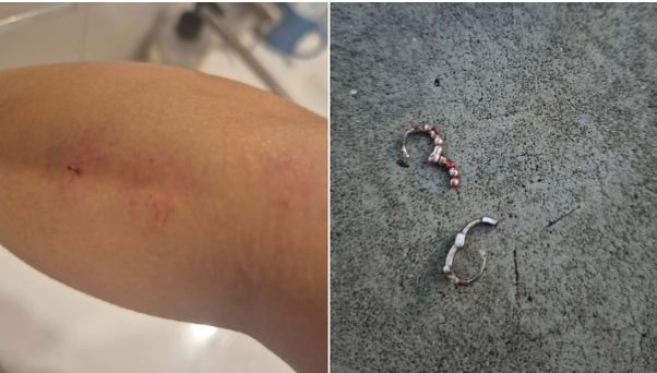 更严重的是,她的耳朵和鼻子都开始流血。左耳的耳洞甚至被打出血,耳环上也沾满了血迹。