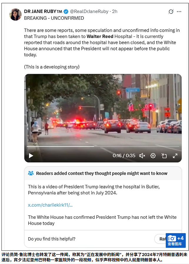 评论员Jane Ruby 更将该事件称为“正在发展中的新闻”,还分享了一段拍摄于宾夕法尼亚州巴特勒医院外的视频,该视频原本与2024年7月针对特朗普的未遂刺杀事件有关,但被误导性地暗示为“周六现场画面”。