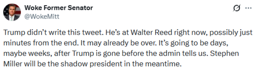 一个自称“觉醒的前参议员”的账号发布的帖子进一步加剧了这种猜测,称特朗普近日在社交媒体上的帖子是他人代发,“他现在在沃尔特·里德医院,可能离生命的尽头只有几分钟了”。