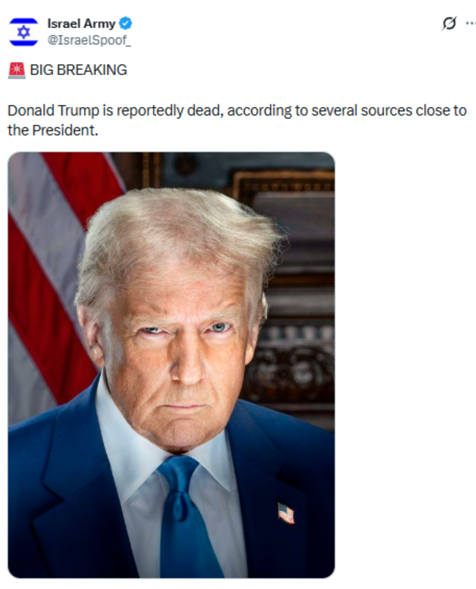 一个名为“以色列军队”的账户也声称:“据几位接近总统的消息人士透露,特朗普据称已经去世。”